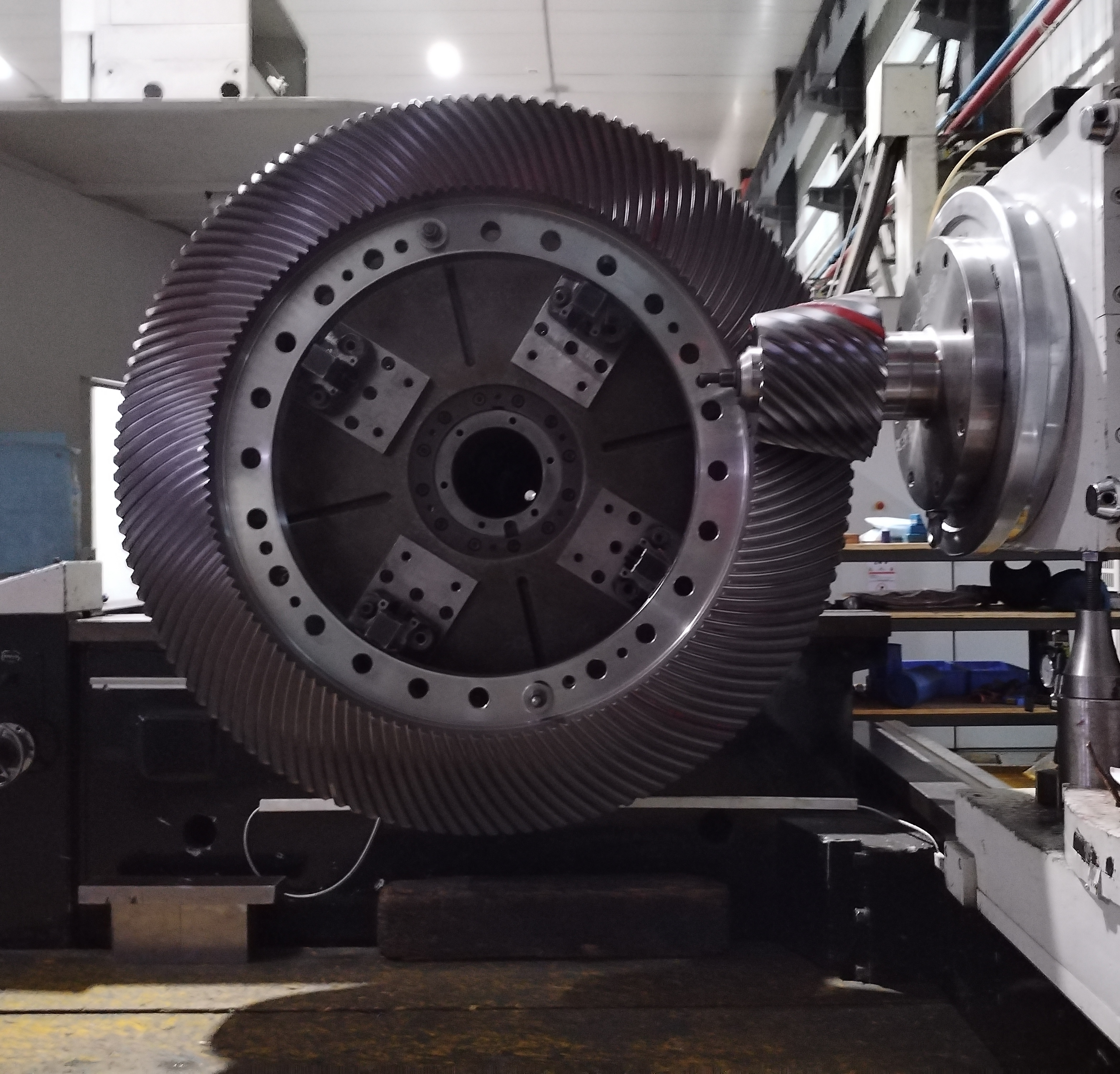 該齒輪直徑1450mm, 采用準(zhǔn)雙曲面齒制。為了降低噪音,采用加大齒寬、大偏置距設(shè)計(jì),增加了重合度。錐齒輪并非越寬越好,為了解決加大齒寬帶來(lái)的加工、嚙合等問(wèn)題,對(duì)齒輪副采取LTCA分析,對(duì)系統(tǒng)用Romax進(jìn)行動(dòng)力學(xué)分析,同時(shí)利用滾檢著色進(jìn)行修形反調(diào)等技術(shù),保證傳動(dòng)嚙合的可靠性。該項(xiàng)目的成果研制,代表著我司錐齒輪設(shè)計(jì)、加工技術(shù)進(jìn)入了深入研究的階段。為大偏置距大尺寸準(zhǔn)雙曲面齒輪加工奠定了基礎(chǔ),也為超齒寬低噪聲錐齒輪的應(yīng)用積累了設(shè)計(jì)和加工經(jīng)驗(yàn)。
